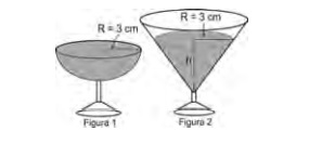 Em um casamento, os donos da festa serviam champanhe aos seus convidados em taças com formato de um hemisfério (Figura 1), porém um acidente na cozinha culminou na quebra de grande parte desses recipientes. Para substituir as taças quebradas, utilizou-se um outro tipo com formato de cone (Figura 2). No entanto, os noivos solicitaram que o volume de champanhe nos dois tipos de taças fosse igual.