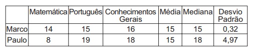 Marco e Paulo foram classificados em um concurso. Para classificação no concurso o candidato deveria obter média aritmética na pontuação igual ou superior a 14. Em caso de empate na média, o desempate seria em favor da pontuação mais regular. No quadro a seguir são apresentados os pontos obtidos nas provas de Matemática, Português e Conhecimentos Gerais, a média, a mediana e o desvio padrão dos dois candidatos.