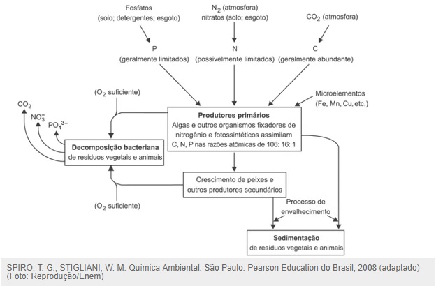 A análise da água de um lago que recebe a descarga de águas residuais provenientes de lavouras adubadas revelou as concentrações dos elementos carbono (21,2 mol/L), nitrogênio (1,2 mol/L) e fósforo (0,2 mol/L). Nessas condições, o nutriente limítrofe é o