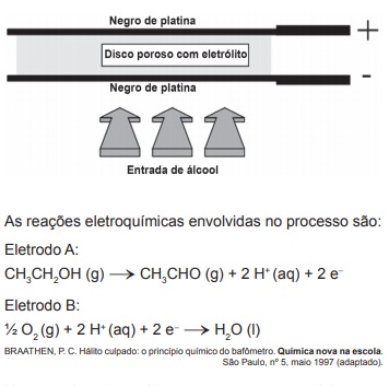 Iniciativas do poder público para prevenir o uso de bebidas alcoólicas por motoristas, causa de muitos acidentes nas estradas do país, trouxeram à ordem do dia, não sem suscitar polêmica, o instrumento popularmente conhecido como bafômetro. Do ponto de vista de detecção e medição, os instrumentos normalmente usados pelas polícias rodoviárias do Brasil e de outros países utilizam o ar que os “suspeitos” sopram para dentro do aparelho, através de um tubo descartável, para promover a oxidação do etanol a etanal. O método baseia-se no princípio da pilha de combustível: o etanol é oxidado em meio ácido sobre um disco plástico poroso coberto com pó de platina (catalisador) e umedecido com ácido sulfúrico, sendo um eletrodo conectado a cada lado desse disco poroso. A corrente elétrica produzida, proporcional à concentração de álcool no ar expirado dos pulmões da pessoa testada, é lida numa escala que é proporcional ao teor de álcool no sangue. O esquema de funcionamento desse detector de etanol pode ser visto na figura.