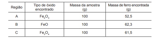 Três amostras de minérios de ferro de regiões distintas foram analisadas e os resultados, com valores aproximados, estão na tabela: