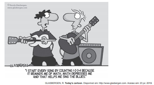 Ao estabelecer uma relação entre a Matemática e o blues a partir da opinião pessoal de um dos rapazes, a charge sugere que
