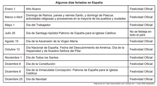 Suponha que uma pessoa queira visitar a Espanha e deseje planejar sua visita de acordo com os feriados nacionais espanhóis. Ao observar o calendário com alguns dos principais feriados espanhóis, essa pessoa constatará que, na Espanha,