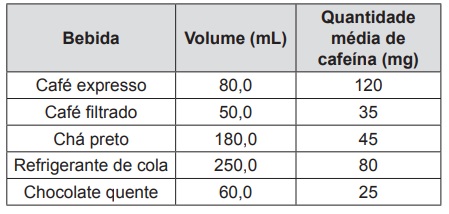 Da análise do quadro conclui-se que o menor teor de cafeína por unidade de volume está presente no