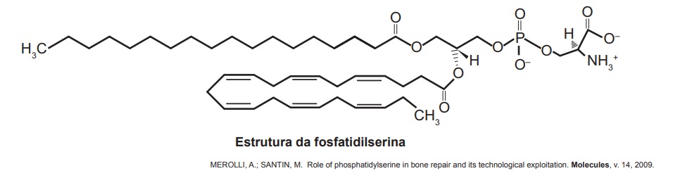 A fosfatidilserina é um fosfolipídio aniônico cuja interação com cálcio livre regula processos de transdução celular e vem sendo estudada no desenvolvimento de biossensores nanométricos. A figura representa a estrutura da fosfatidilserina: