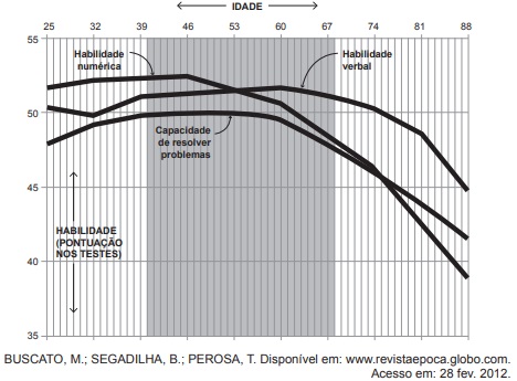 Em variados momentos de nossa vida, precisamos interpretar as diferentes linguagens dos sistemas de comunicação. O gráfico é um desses sistemas, que, no caso apresentado, indica que as habilidades associadas à inteligência humana variam de acordo com a idade. Considerando essa informação, constata-se que