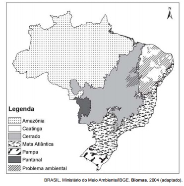 No mapa estão representados os biomas brasileiros que, em função de suas características físicas e do modo de ocupação do território, apresentam problemas ambientais distintos. Nesse sentido, o problema ambiental destacado no mapa indica.