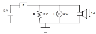 Fusíveis são dispositivos de proteção de um circuito elétrico, sensíveis ao excesso de corrente elétrica. Os modelos mais simples consistem de um filamento metálico de baixo ponto de fusão, que se funde quando a corrente ultrapassa determinado valor, evitando que as demais partes do circuito sejam danificadas. A figura mostra um diagrama de um circuito em que o fusível F protege um resistor R de 12 Ω, uma lâmpada L de 6 W e um alto-falante que conduz 1 A.