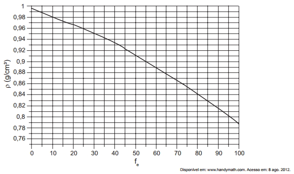 O álcool utilizado como combustível automotivo (etanol hidratado) deve apresentar uma taxa máxima de água em sua composição para não prejudicar o funcionamento do motor. Uma maneira simples e rápida de estimar a quantidade de etanol em misturas com água é medir a densidade da mistura. O gráfico mostra a variação da densidade da mistura (água e etanol) com a fração percentual da massa de etanol (fe), dada pela expressão