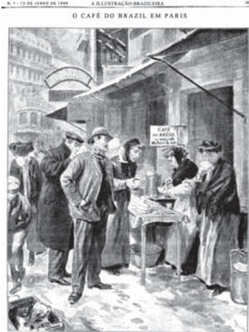 Uma scena franco-brazileira: “franco” – pelo local e os personagens, o local que é Paris e os personagens que são pessoas do povo da grande capital; “brazileira” pelo que ahi se está bebendo: café do Brazil. O Lettreiro diz a verdade apregoando que esse é o melhor de todos os cafés. (Essa página foi desenhada especialmente para A Ilustração Brazileira pelo Sr. Tofani, desenhista do Je Sais Tout.)