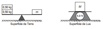 A figura mostra uma balança de braços iguais, em equilíbrio, na Terra, onde foi colocada uma massa m, e a indicação de uma balança de força na Lua, onde a aceleração da gravidade é igual a 1,6 m/s², sobre a qual foi colocada uma massa M.