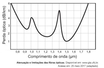 Em uma linha de transmissão de informações por fibra óptica, quando um sinal diminui sua intensidade para valores inferiores a 10 dB, este precisa ser retransmitido. No entanto, intensidades superiores a 100 dB não podem ser transmitidas adequadamente. A figura apresenta como se dá a perda de sinal (perda óptica) para diferentes comprimentos de onda para certo tipo de fibra óptica.