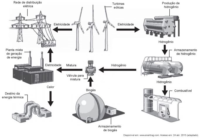 A figura mostra o funcionamento de uma estação híbrida de geração de eletricidade movida a energia eólica e biogás. Essa estação possibilita que a energia gerada no parque eólico seja armazenada na forma de gás hidrogênio, usado no fornecimento de energia para a rede elétrica comum e para abastecer células a combustível.