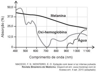 A epilação a laser (popularmente conhecida como depilação a laser) consiste na aplicação de uma fonte de luz para aquecer e causar uma lesão localizada e controlada nos folículos capilares. Para evitar que outros tecidos sejam danificados, selecionam-se comprimentos de onda que são absorvidos pela melanina presente nos pelos, mas que não afetam a oxi-hemoglobina do sangue e a água dos tecidos da região em que o tratamento será aplicado. A figura mostra como é a absorção de diferentes comprimentos de onda pela melanina, oxi-hemoglobina e água.