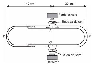 O trombone de Quincke é um dispositivo experimental utilizado para demonstrar o fenômeno da interferência de ondas sonoras. Uma fonte emite ondas sonoras de determinada frequência na entrada do dispositivo. Essas ondas se dividem pelos dois caminhos (ADC e AEC) e se encontram no ponto C, a saída do dispositivo, onde se posiciona um detector. O trajeto ADC pode ser aumentado pelo deslocamento dessa parte do dispositivo. Com o trajeto ADC igual ao AEC, capta-se um som muito intenso na saída. Entretanto, aumentando-se gradativa mente o trajeto ADC, até que ele fique como mostrado na figura, a intensidade do som na saída fica praticamente nula. Desta forma, conhecida a velocidade do som no interior do tubo (320 m/s), é possível determinar o valor da frequência do som produzido pela fonte.