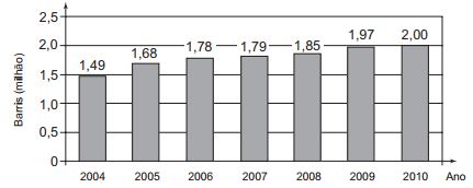 O gráfico mostra a média de produção diária de petróleo no Brasil, em milhão de barris, no período de 2004 a 2010.