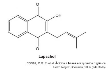 Diversos produtos naturais podem ser obtidos de plantas por processo de extração. O lapachol é da classe das naftoquinonas. Sua estrutura apresenta uma hidroxila enólica (pKa = 6,0) que permite que este composto seja isolado da serragem dos ipês por extração com solução adequada, seguida de filtração simples. Considere que pKa = -log Ka, em que Ka é a constante ácida da reação de ionização do lapachol.