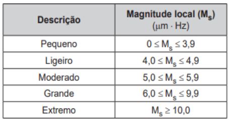 O quadro mostra a escala de magnitude local (Ms) de um terremoto que é utilizada para descrevê-lo.