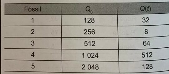 em que t é o tempo, medido em ano, Q(t) é a quantidade de carbono 14 medida no instante t e Q0 é a quantidade de carbono 14 no ser vivo correspondente.Um grupo de arqueólogos, numa de suas expedições, encontrou 5 fósseis de espécies conhecidas e mediram a