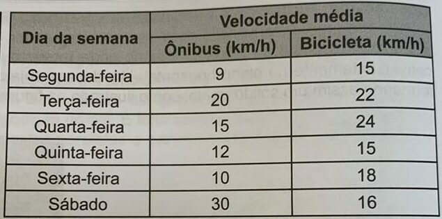 O quadro fornece as velocidades médias do ônibus e da bicicleta, em km/h, no trajeto metrô-universidade.