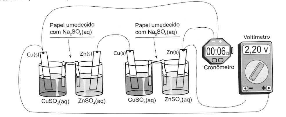 É possível ligar aparelhos elétricos de baixa corrente utilizando materiais comuns de laboratório no lugar das tradicionais pilhas. A ilustração apresenta uma montagem que faz funcionar um cronômetro digital.