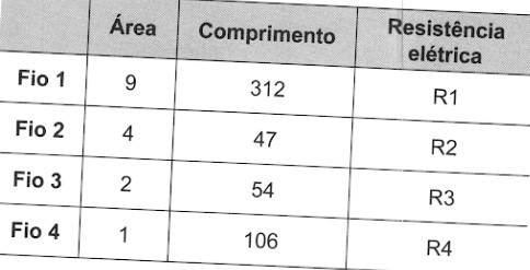 Cientistas da Universidade de New South Wales, na Austrália, demonstraram em 2012 que a Lei de Ohm é válida mesmo para fios finíssimos, cuja área da seção reta compreende alguns poucos átomos. A tabela apresenta as áreas e comprimentos de alguns dos fios construídos (respectivamente com as mesmas unidades de medida). Considere que a resistividade mantém-se constante para todas as geometrias (uma aproximação confirmada pelo estudo).