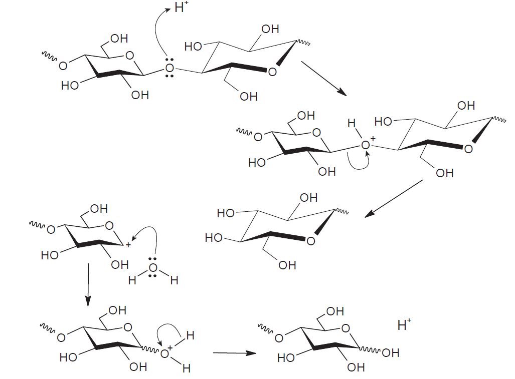 A biomassa celulósica pode ser utilizada para a produção de etanol de segunda geração. Entretanto, é necessário que os polissacarídeos sejam convertidos em mono e dissacarídeos, processo que pode ser conduzido em meio ácido, conforme mostra o esquema: