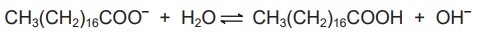 Em solução, os ânions do sabão podem hidrolisar a água e, desse modo, formar o ácido carboxílico correspondente. Por exemplo, para o estearato de sódio, é estabelecido o seguinte equilíbrio: